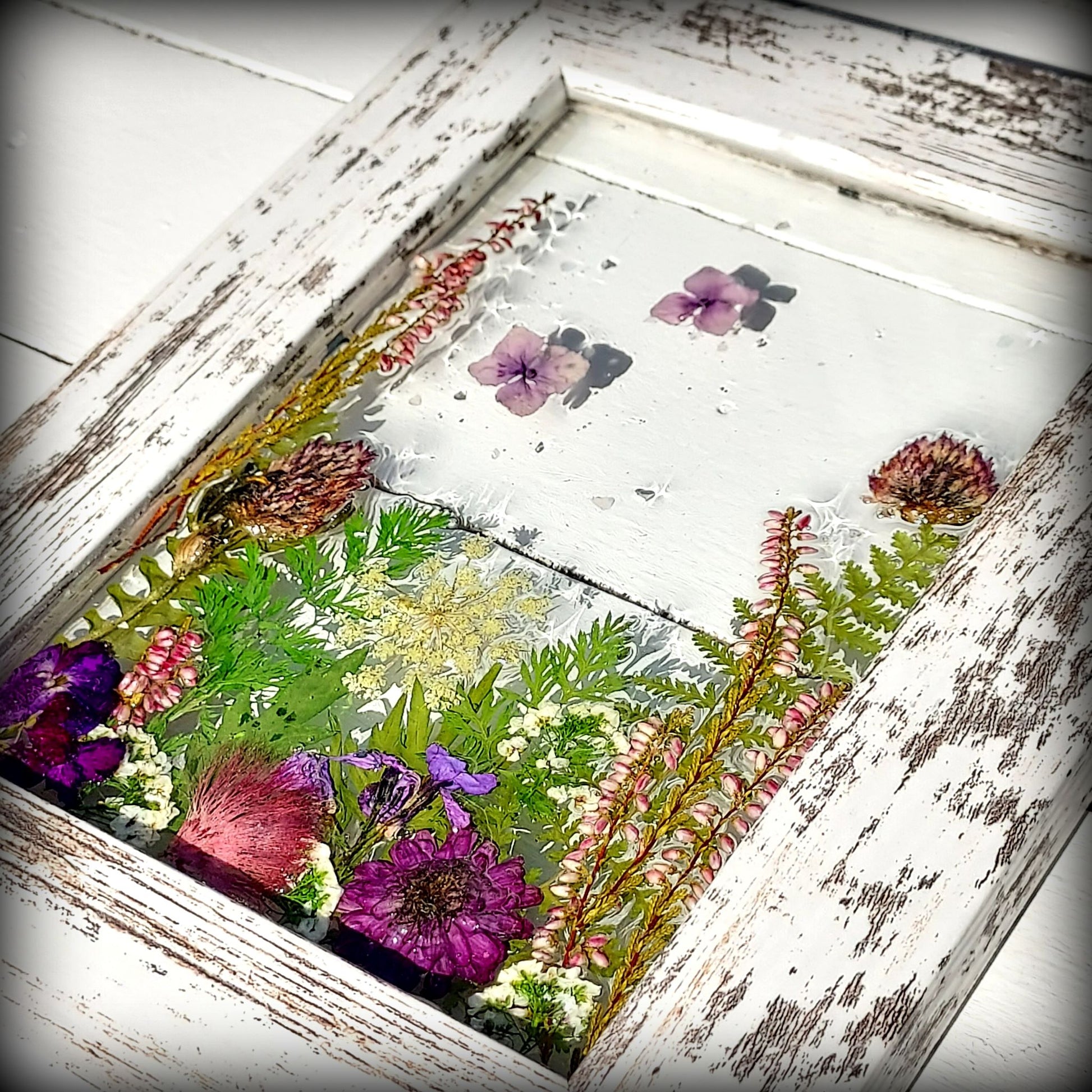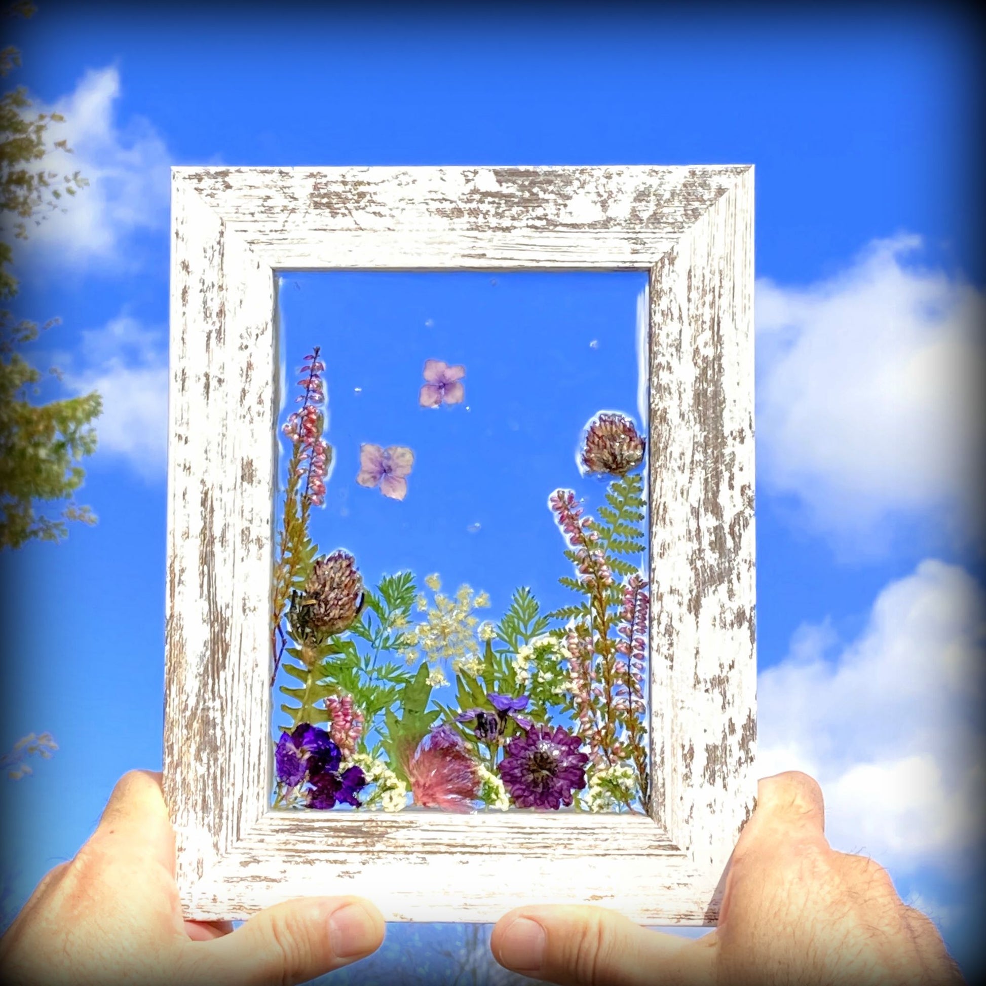 These whimsical frames are created from flowers and fauna gathered from our gardens and when on nature walks. We take delight in creating happy scenes that we hope will bring a smile to your face and light up your space with color and joy.
