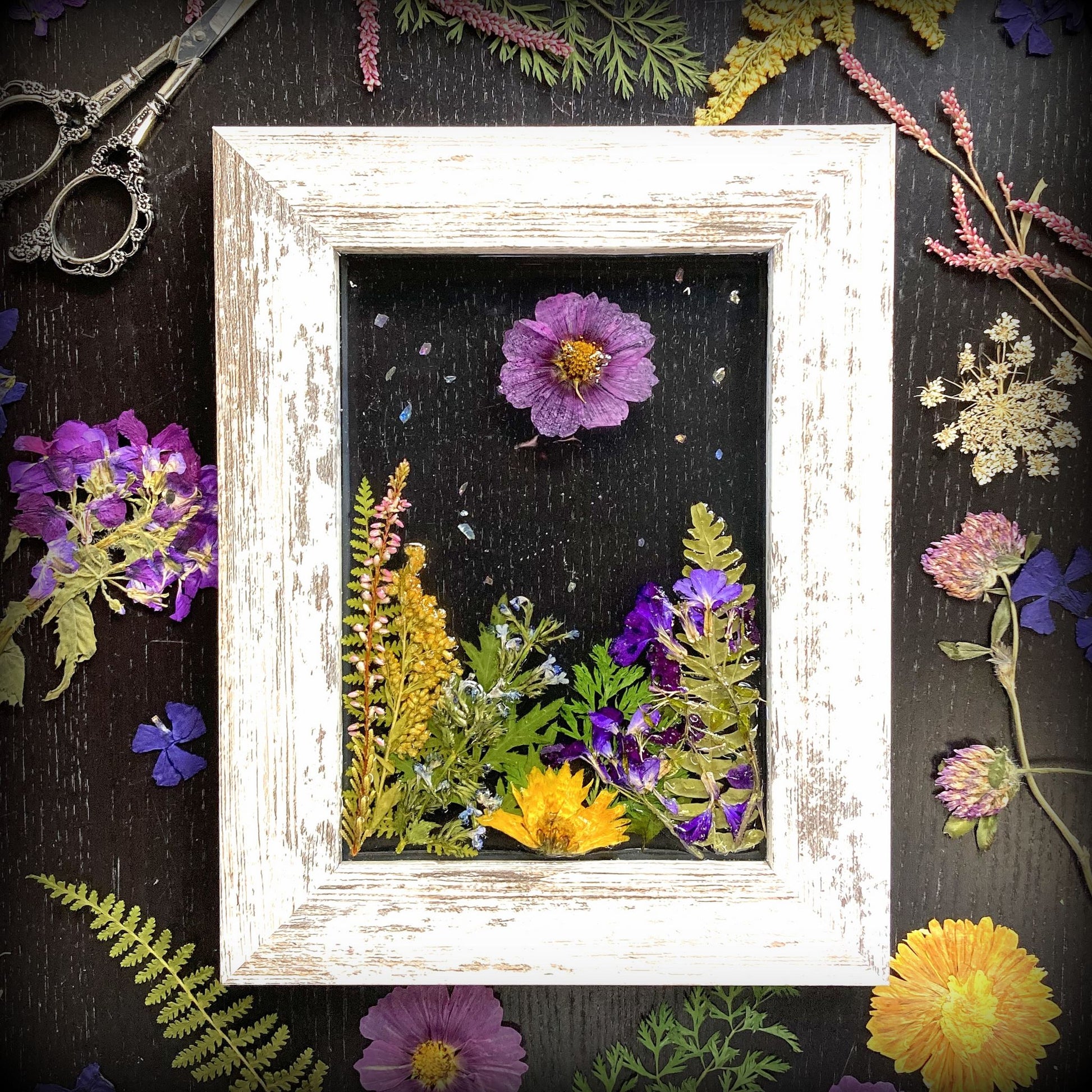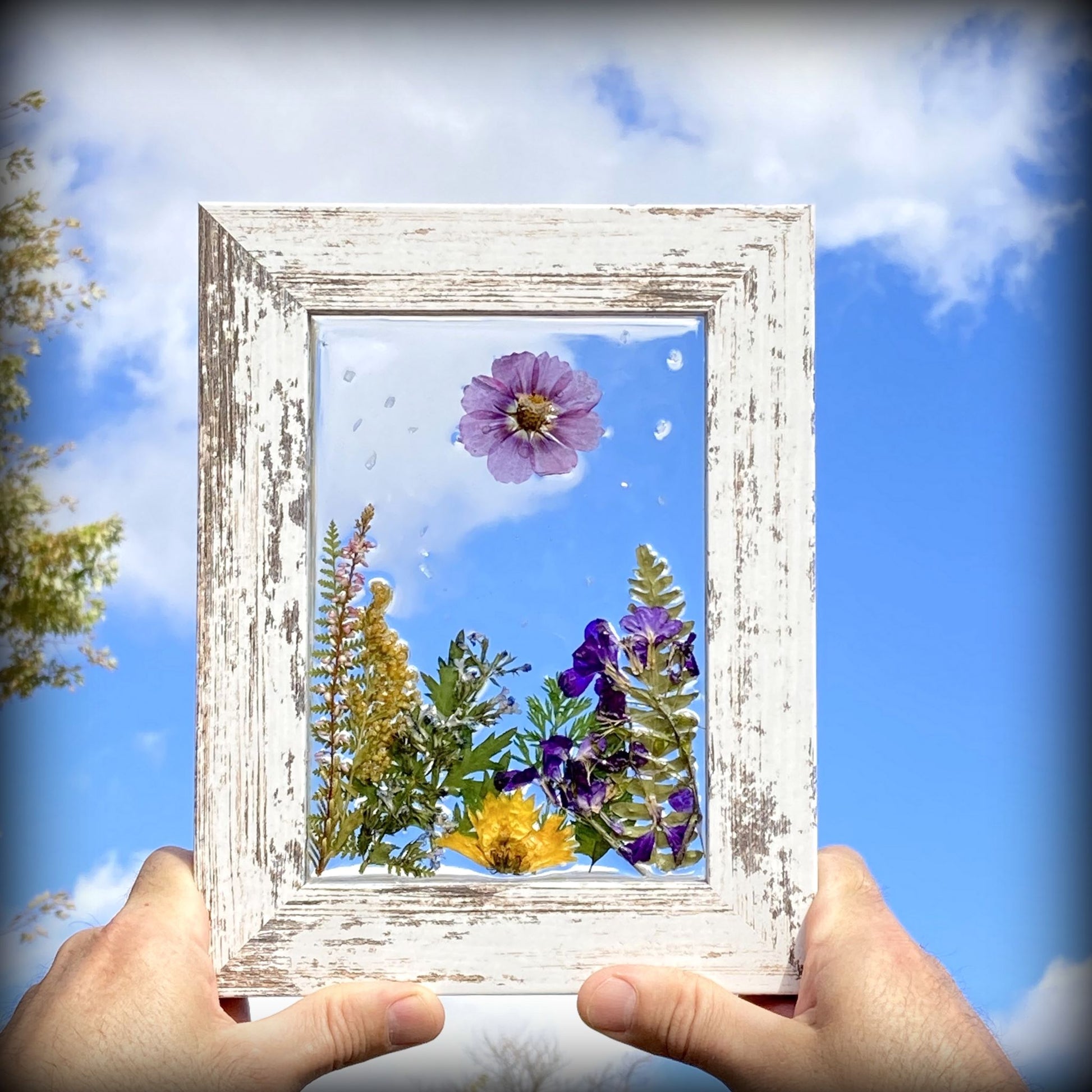 These whimsical frames are created from flowers and fauna gathered from our gardens and when on nature walks. We take delight in creating happy scenes that we hope will bring a smile to your face and light up your space with color and joy.