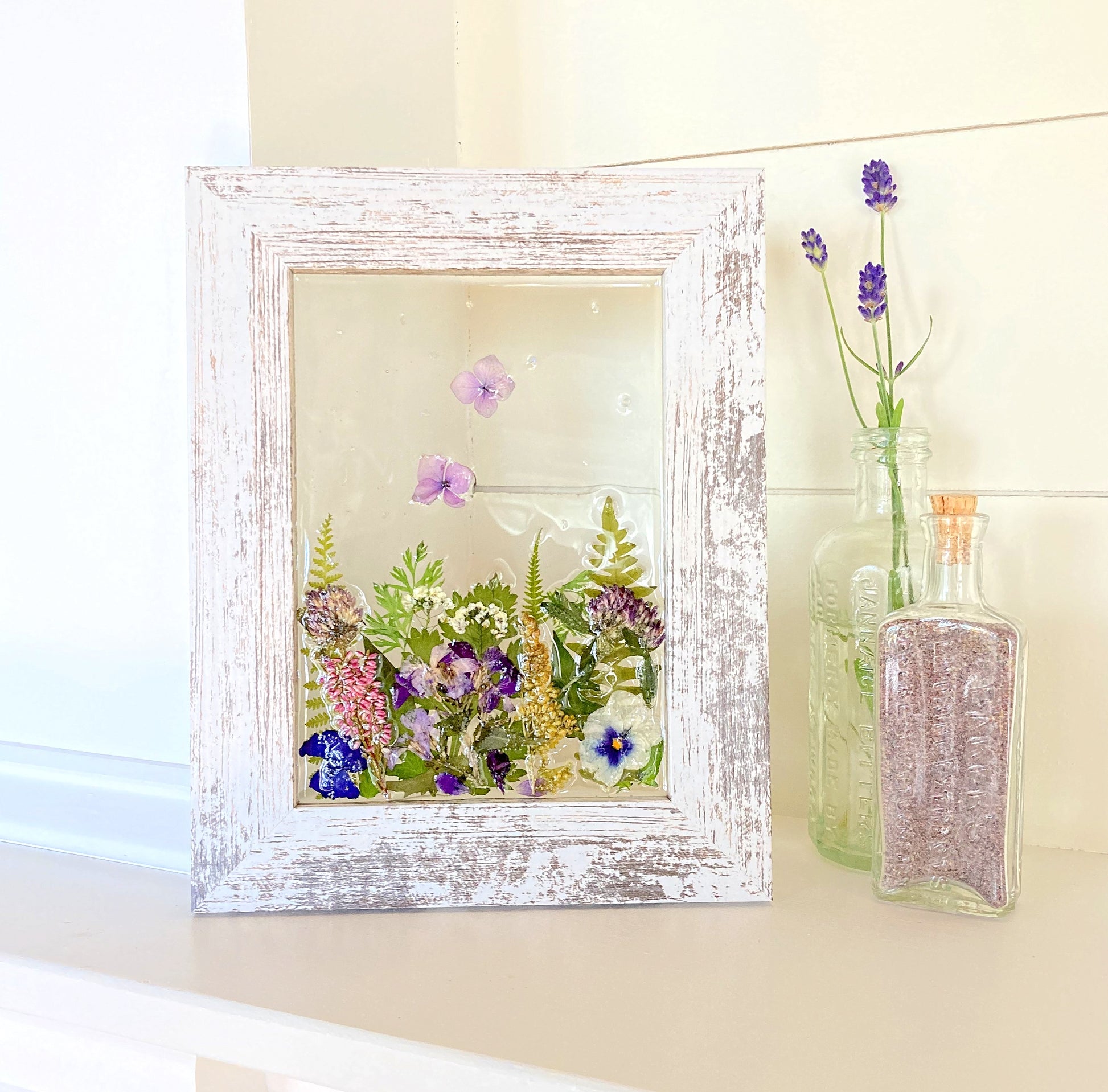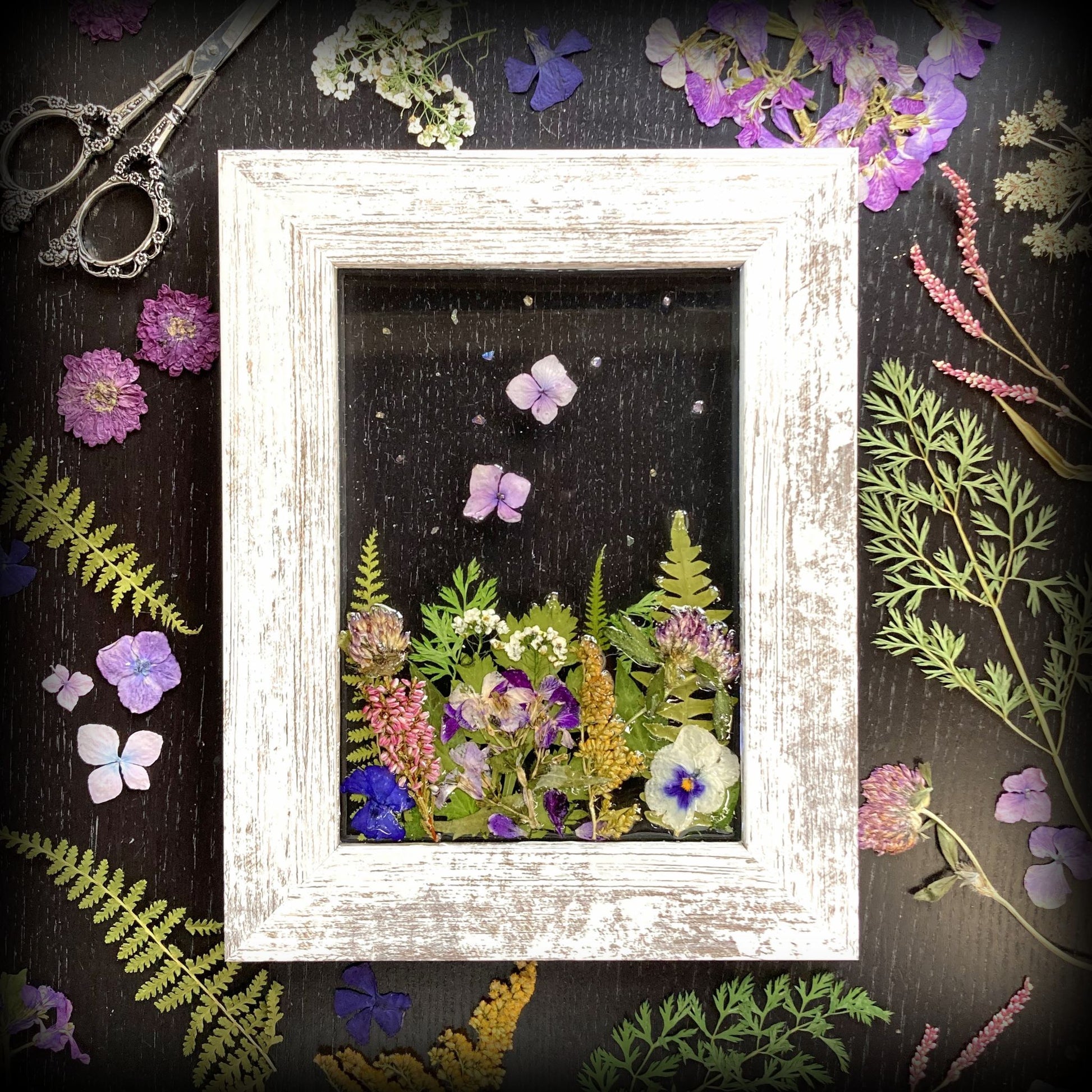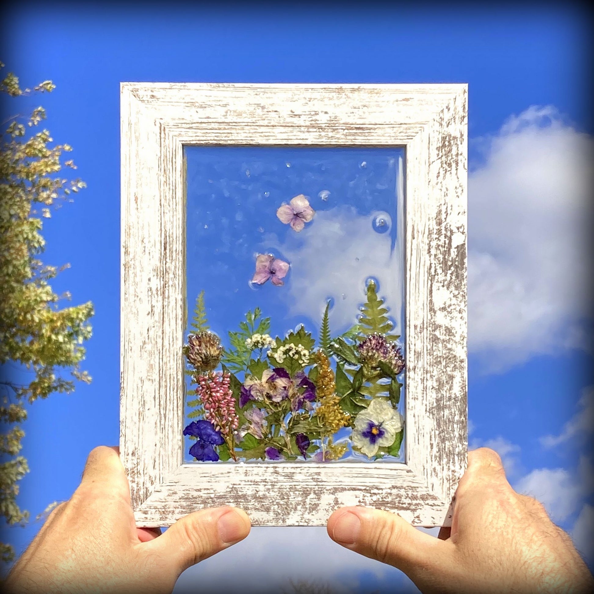 These whimsical frames are created from flowers and fauna gathered from our gardens and when on nature walks. We take delight in creating happy scenes that we hope will bring a smile to your face and light up your space with color and joy.