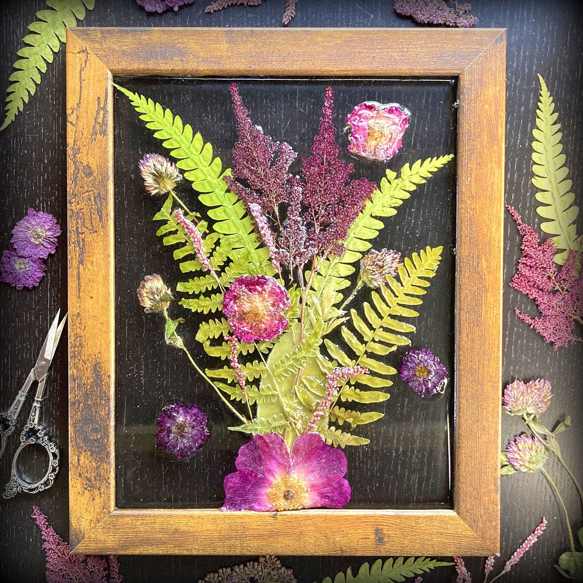 Our Beach Bouquet frames consist of a variety of ferns native to New England and Florida, purple clover, roses, astilbe, mums, beach roses and more!