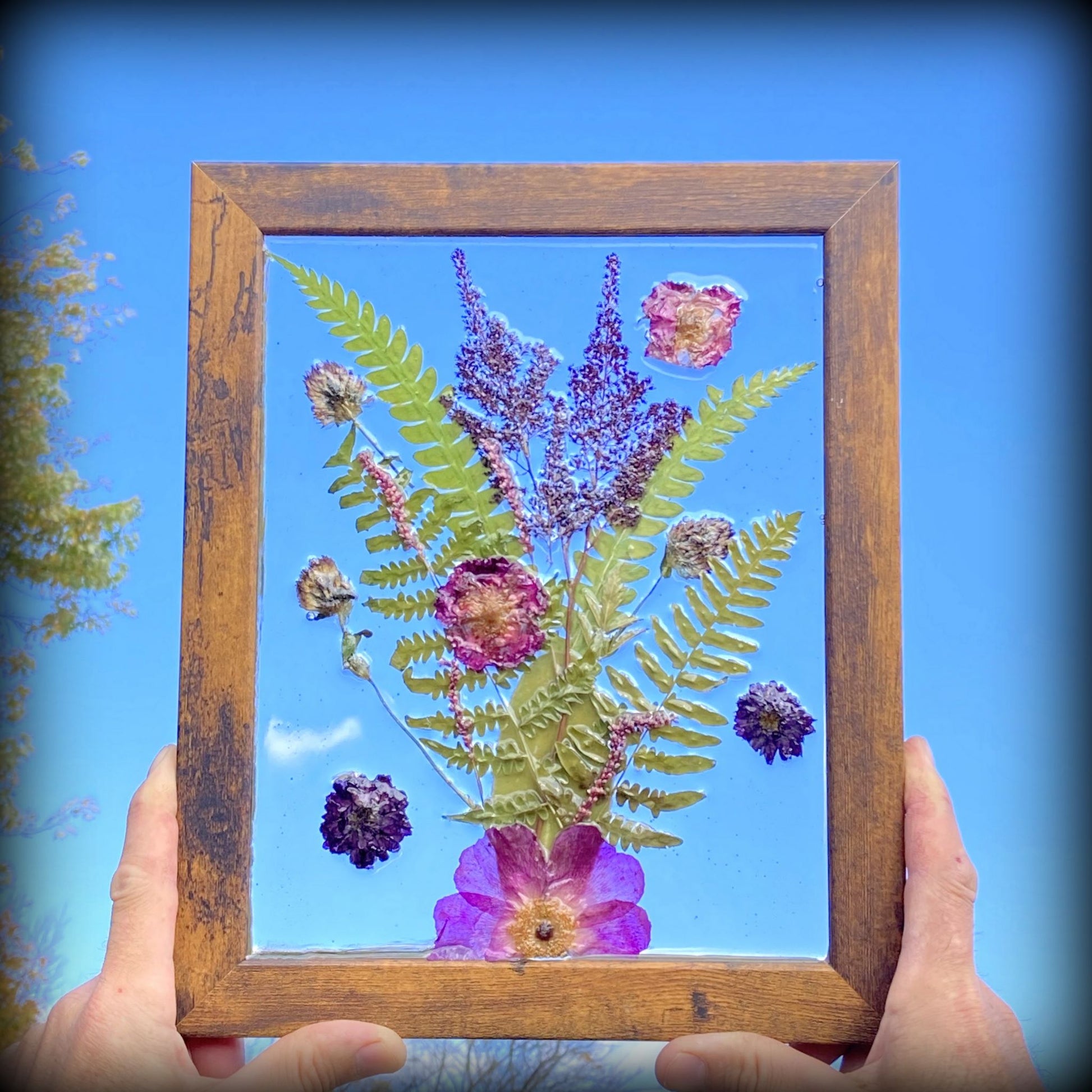 These whimsical frames are created from flowers and fauna gathered from our gardens and when on nature walks. We take delight in creating happy scenes that we hope will bring a smile to your face and light up your space with color and joy.