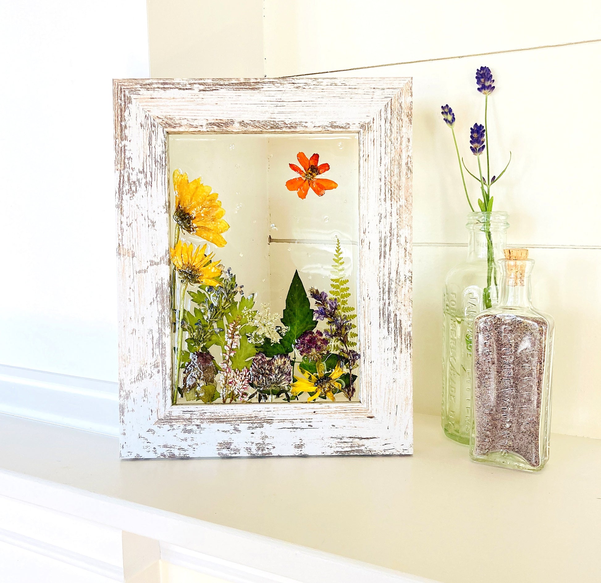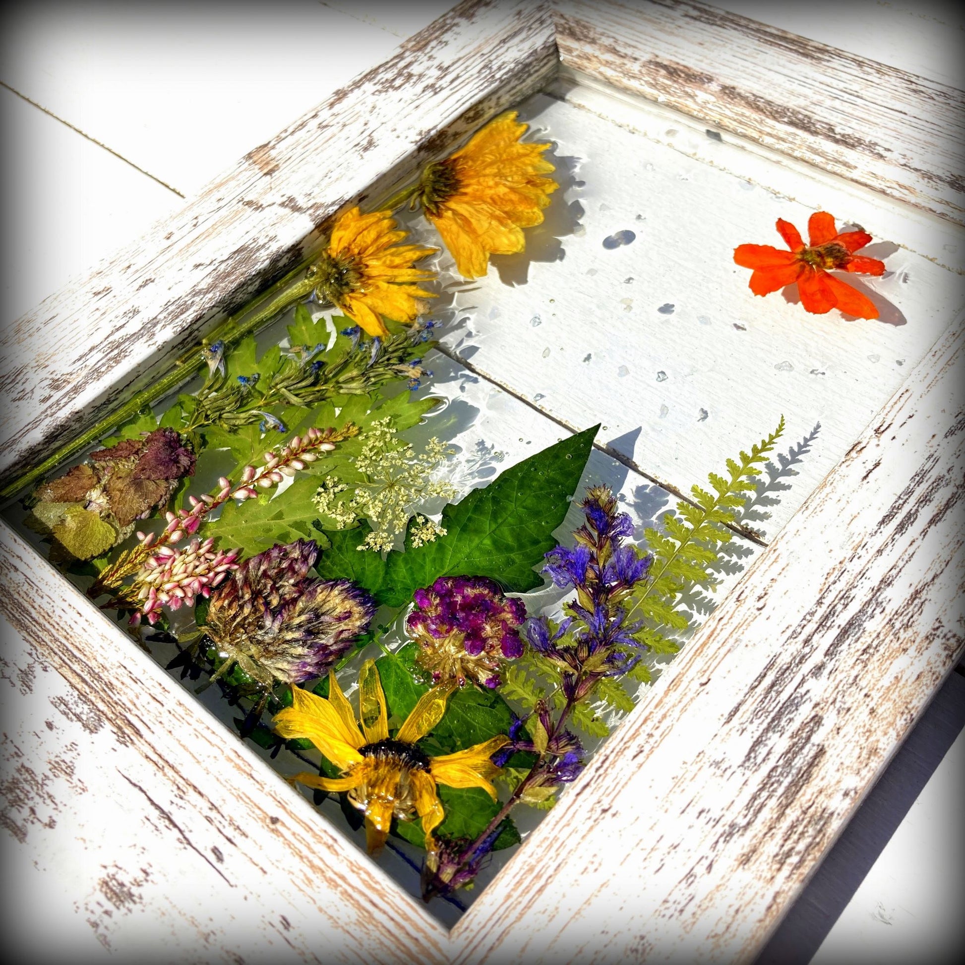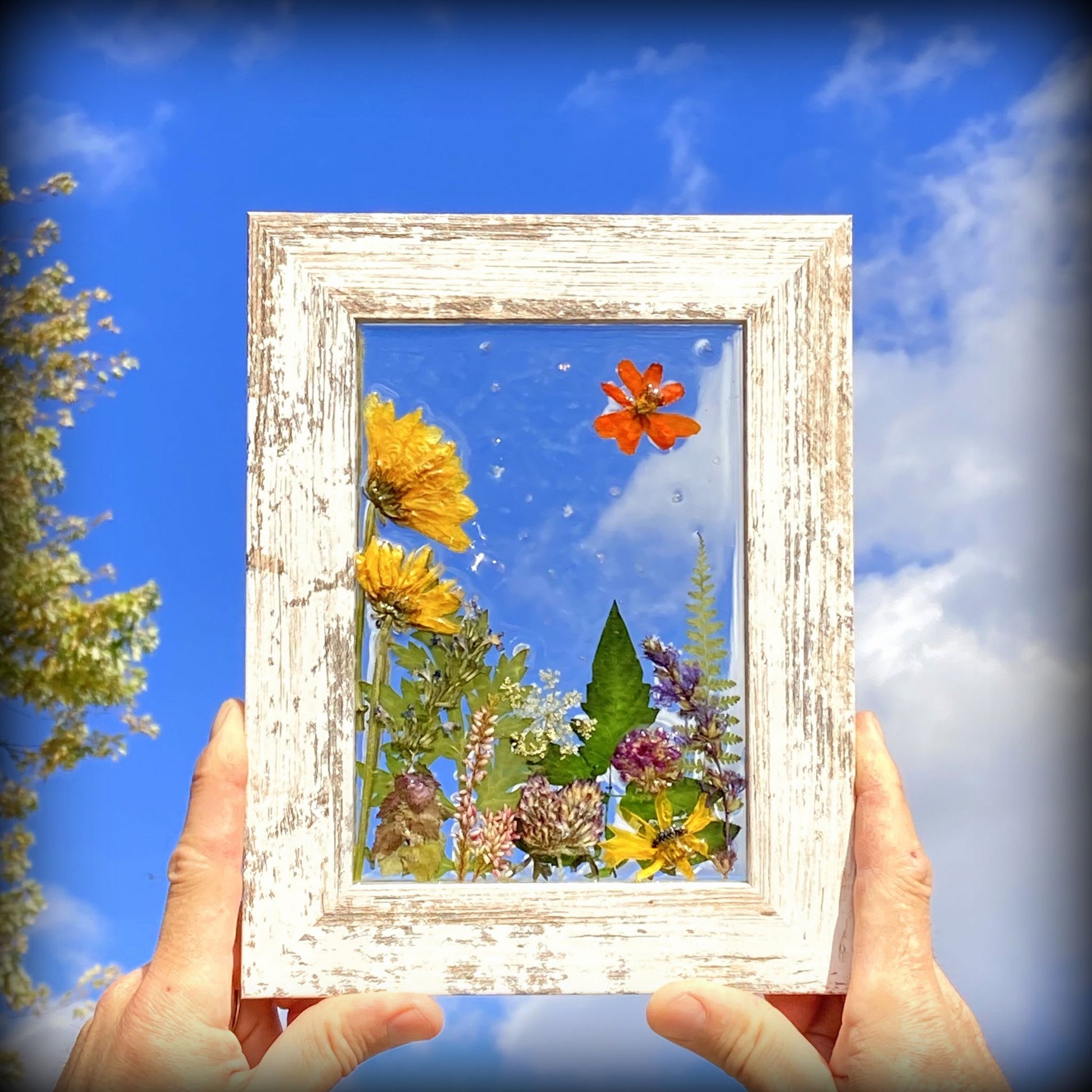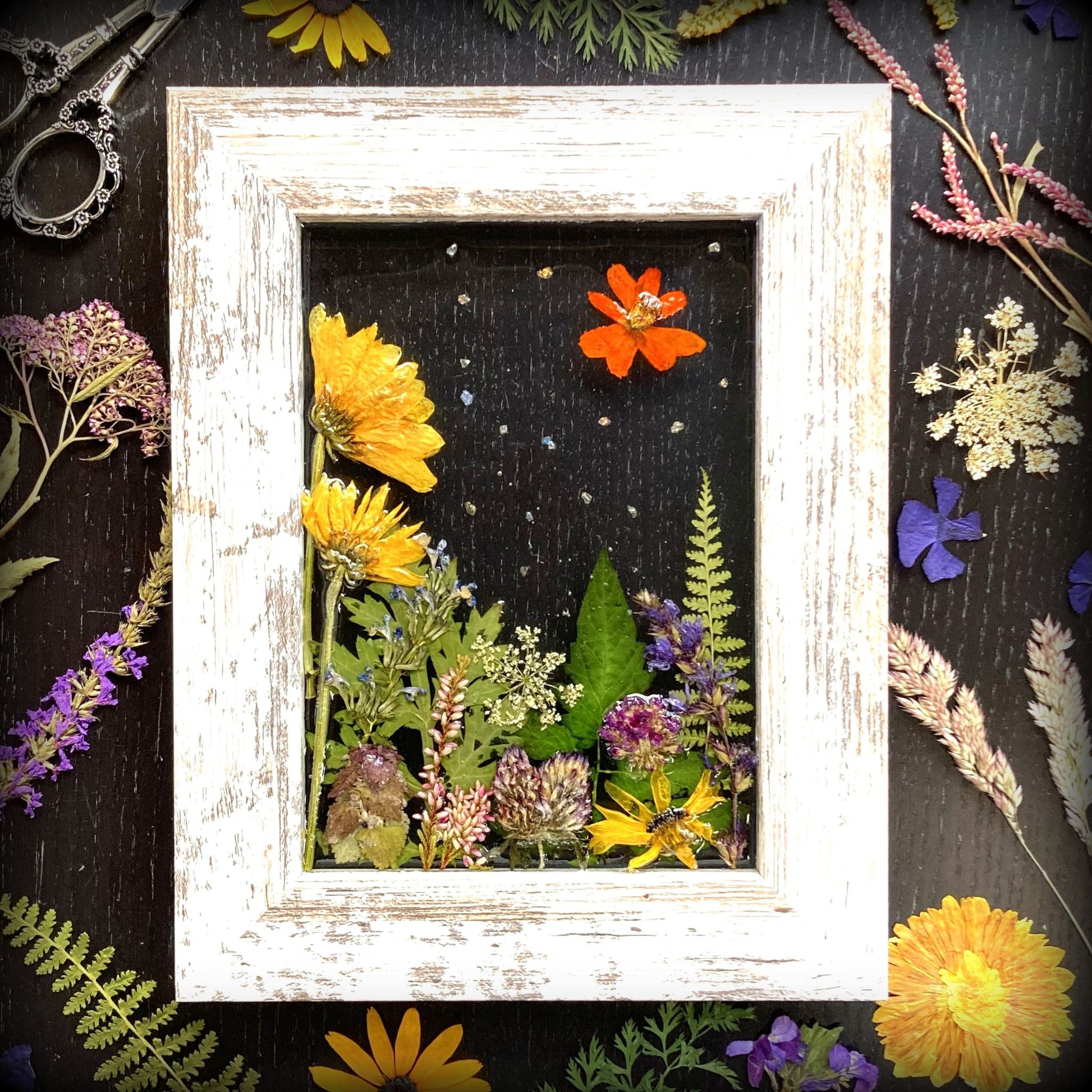 These whimsical frames are created from flowers and fauna gathered from our gardens and when on nature walks. We take delight in creating happy scenes that we hope will bring a smile to your face and light up your space with color and joy.