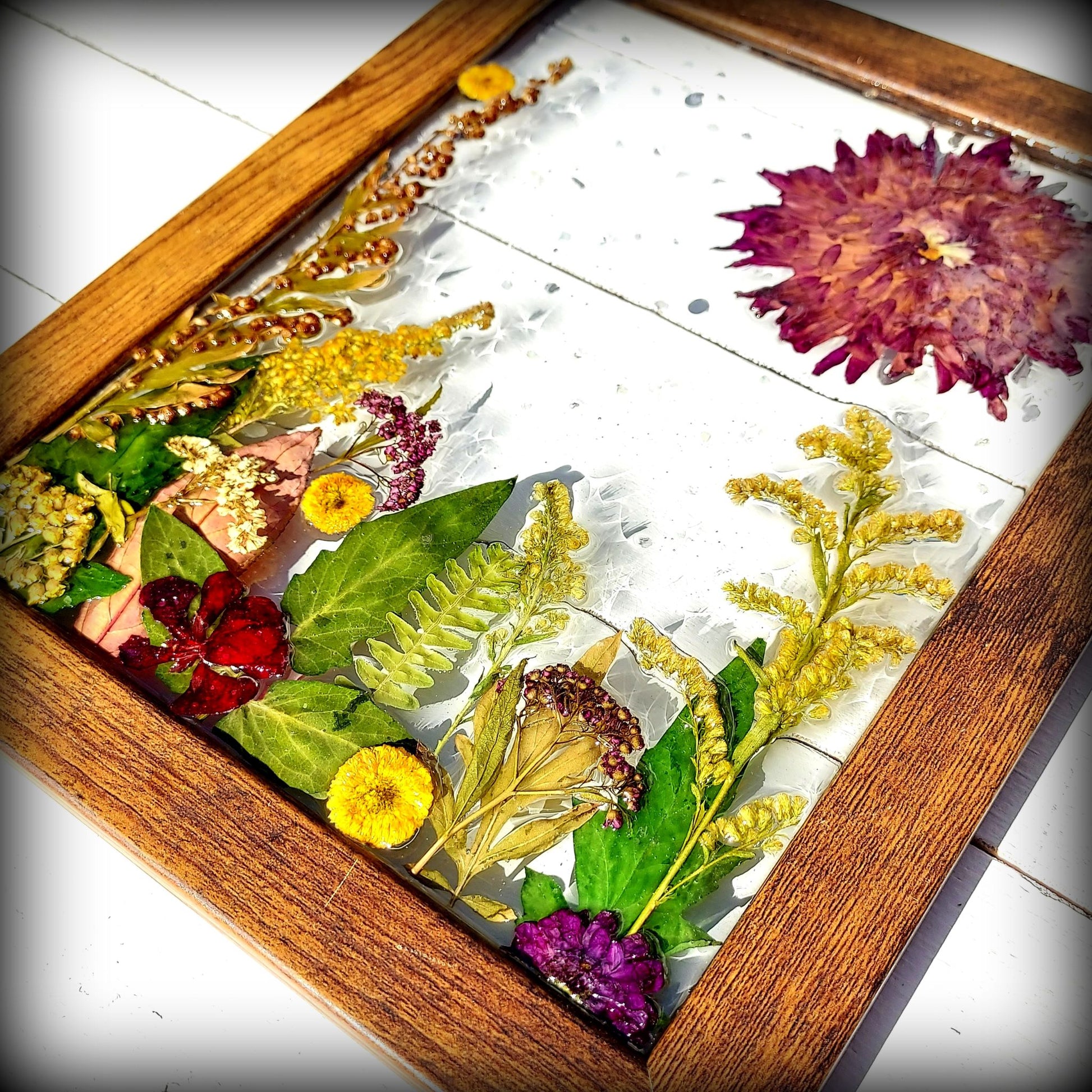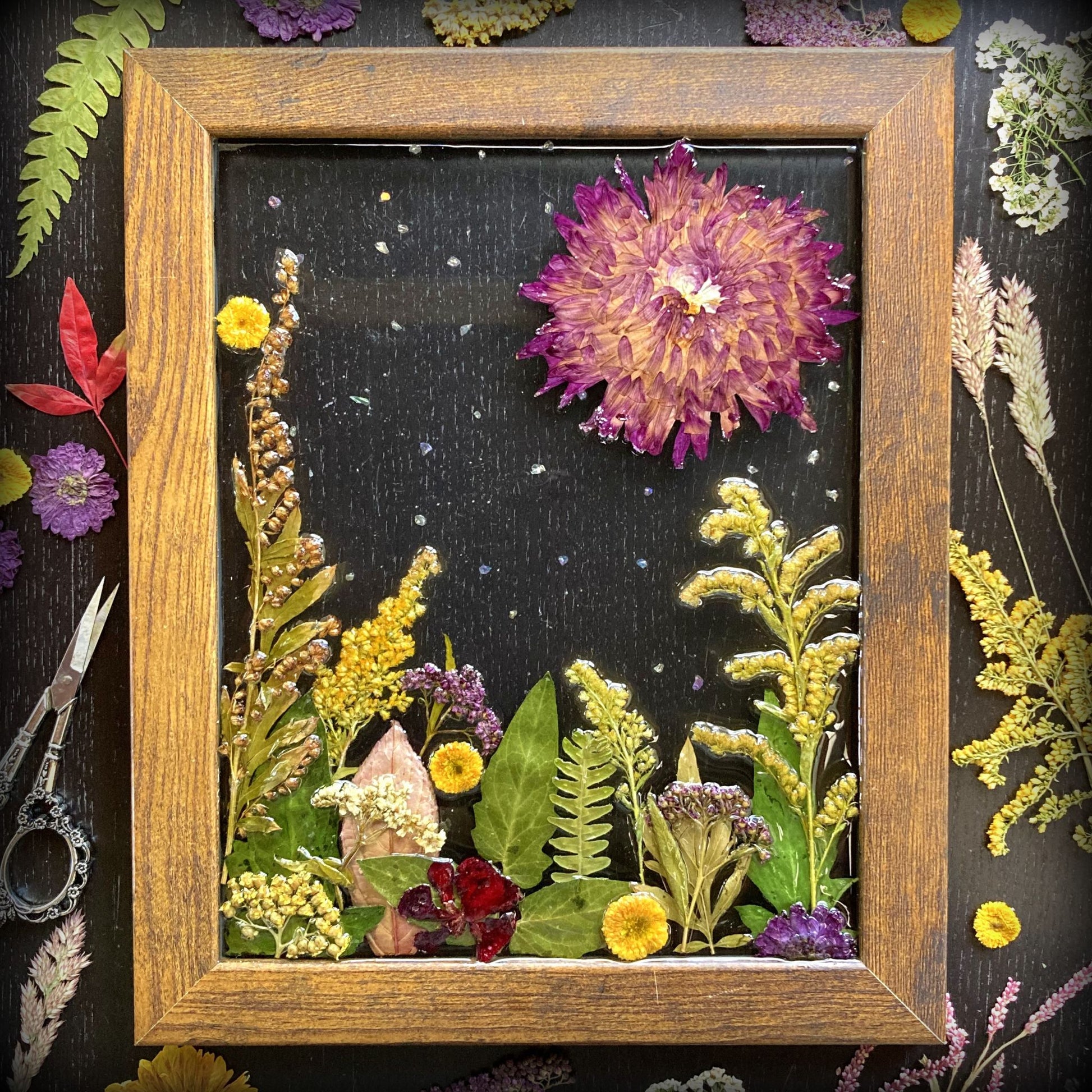 Enjoy a later summer nature walk and see flowers like you'd find in our Golden Meadows frames. A beautiful Mum for the "sun", cut glass that we like to think of as fairies or sun sparkles in the "sky", and the wonderful texture and colors created with wild weeds, goldenrod, ferns, buckwheat, tomato leaves make this piece a stunner!