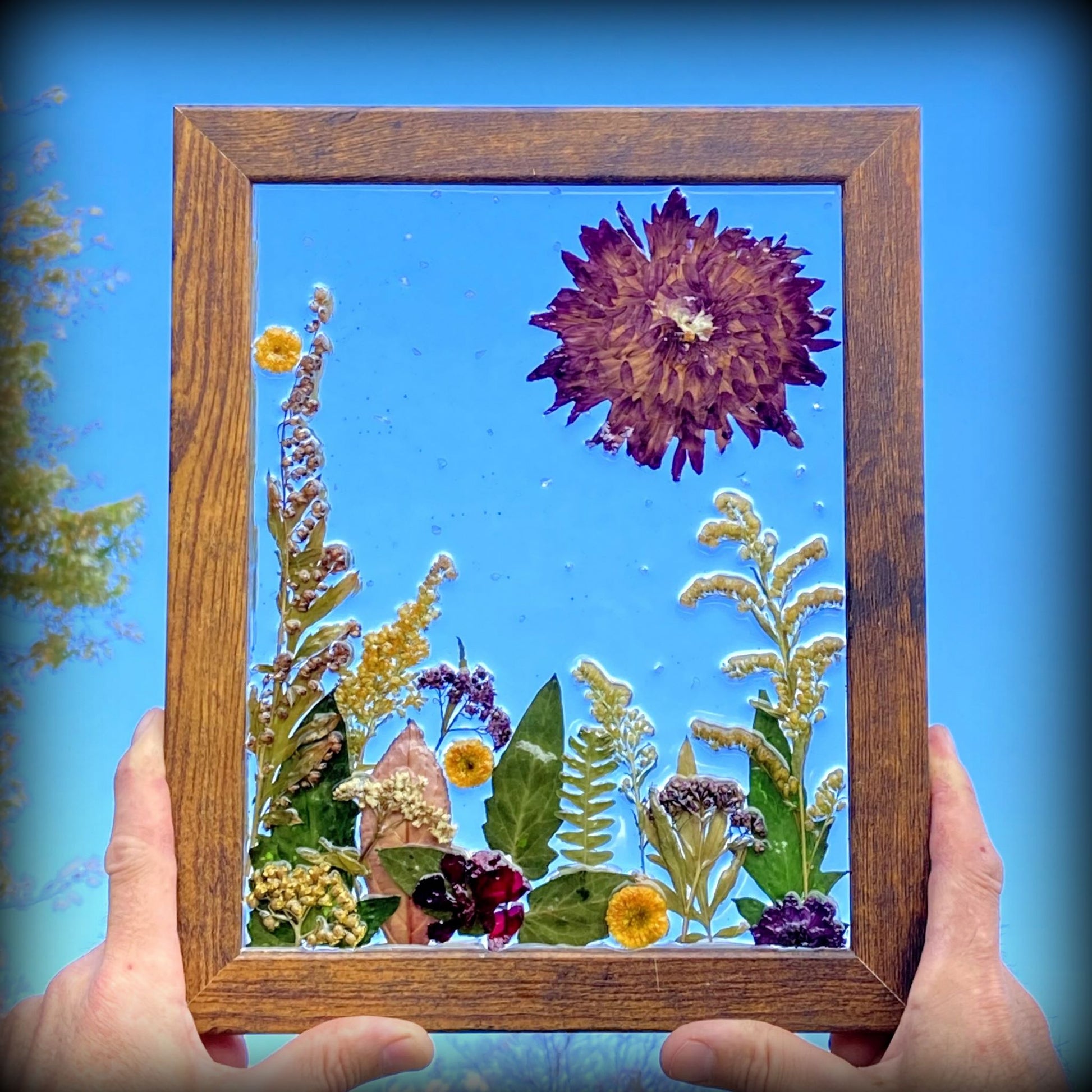 These whimsical frames are created from flowers and fauna gathered from our gardens and when on nature walks. We take delight in creating happy scenes that we hope will bring a smile to your face and light up your space with color and joy.