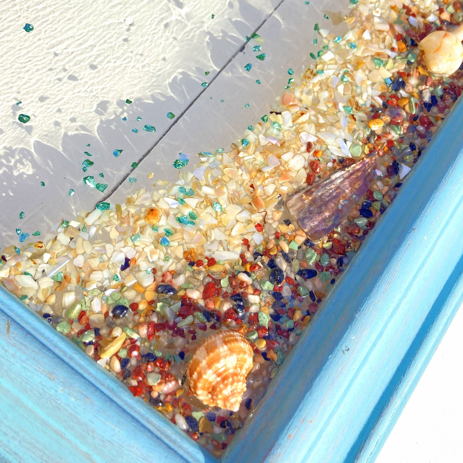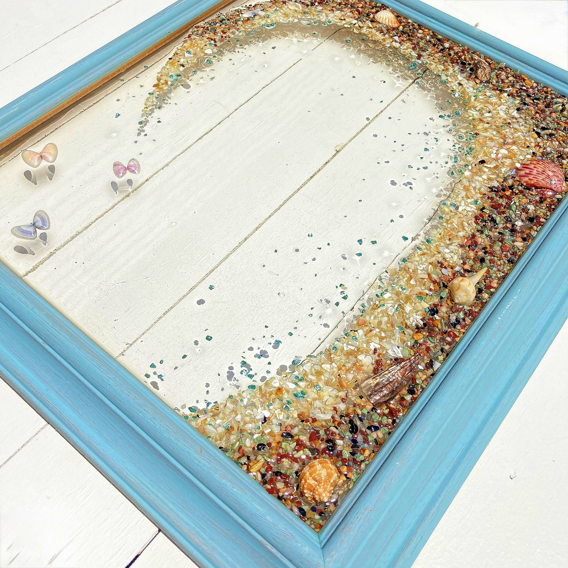 This piece has "stolen our hearts" with its soothing colors and sweetness. We can't help but hear Doris Days, "On Moonlight Bay" when we look at this piece! This sweet frame would look so lovely in a child's room, self - care room, kitchen or anywhere else you want to have a soft smile brought to your face. Soothing sea foam bubble rocks are accented with shimmering cut glass, while several shell butterflies dance on the music notes in the sky.
