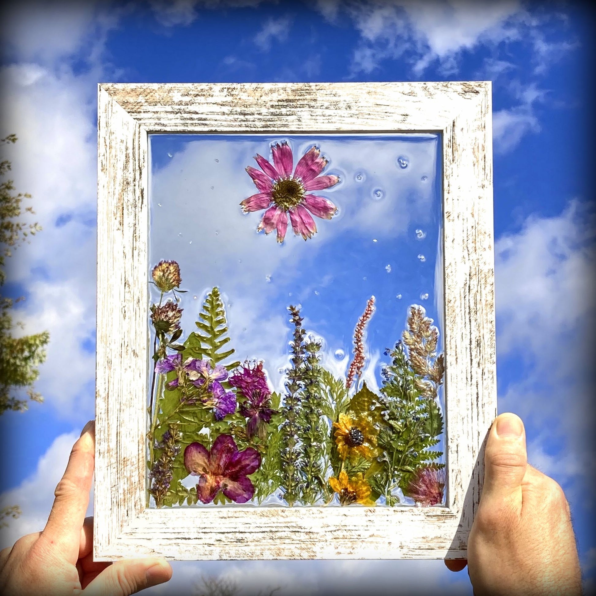 These whimsical frames are created from flowers and fauna gathered from our gardens and when on nature walks. We take delight in creating happy scenes that we hope will bring a smile to your face and light up your space with color and joy.