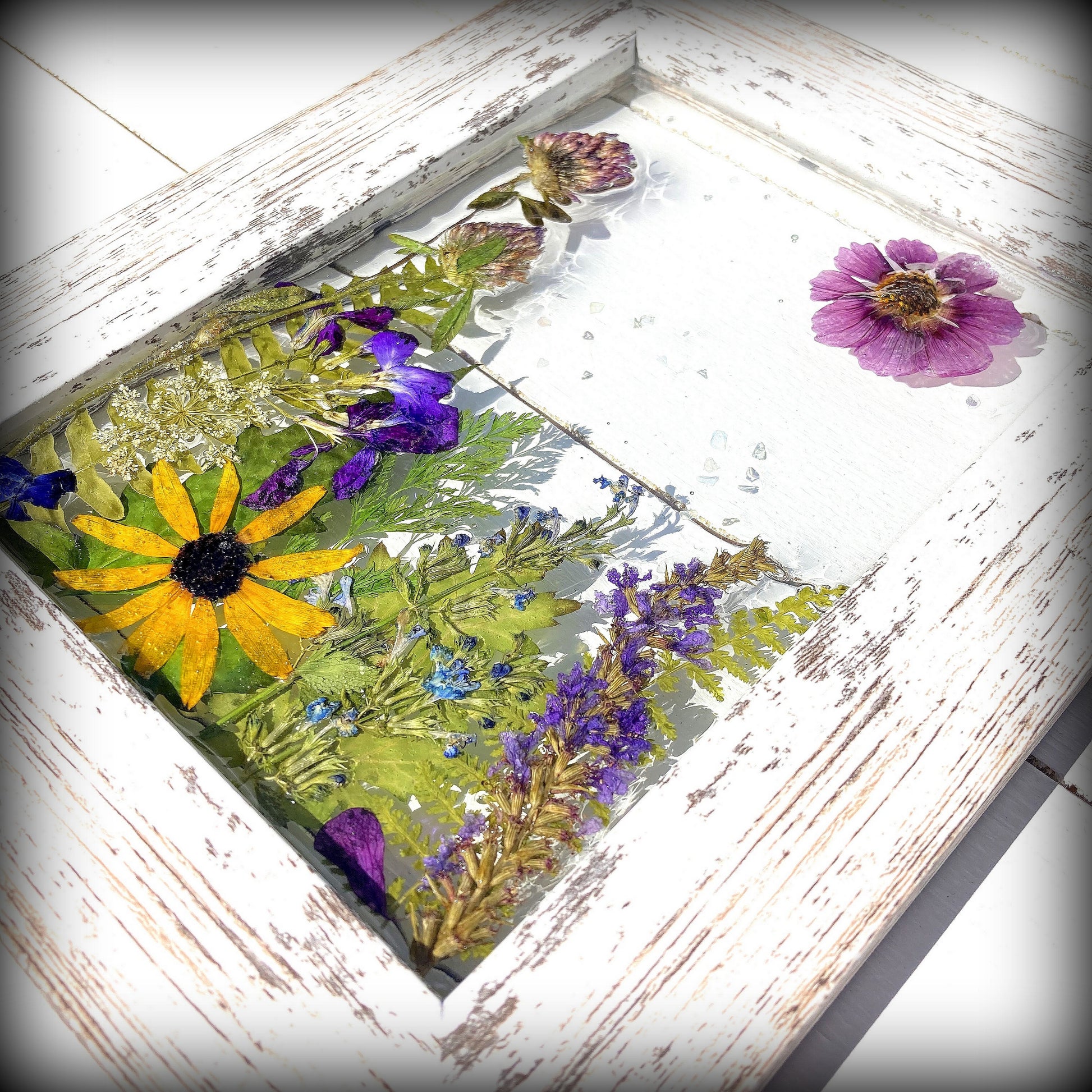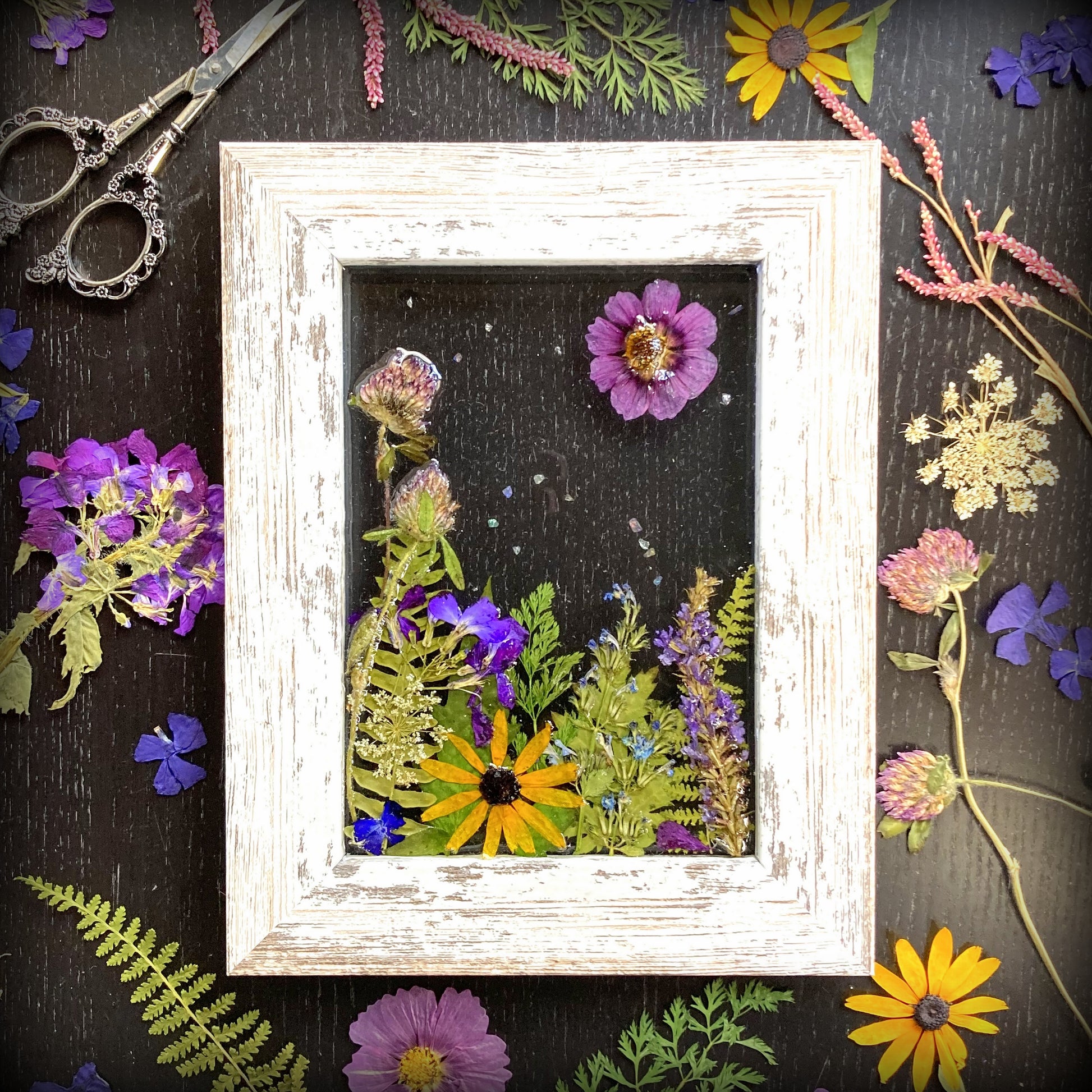 These whimsical frames are created from flowers and foliage gathered from our gardens and when on nature walks. We take delight in creating happy scenes that we hope will bring a smile to your face and light up your space with color and joy.