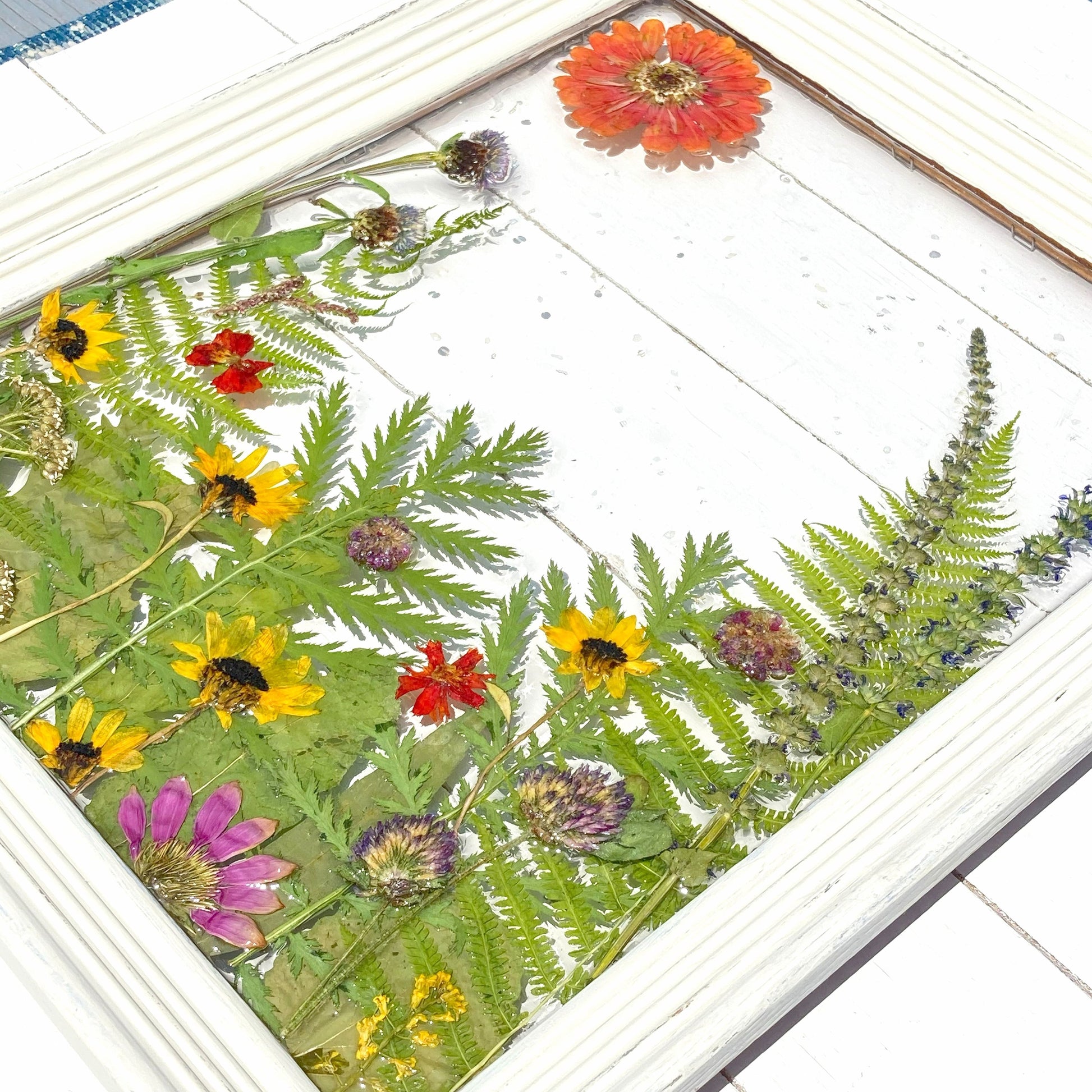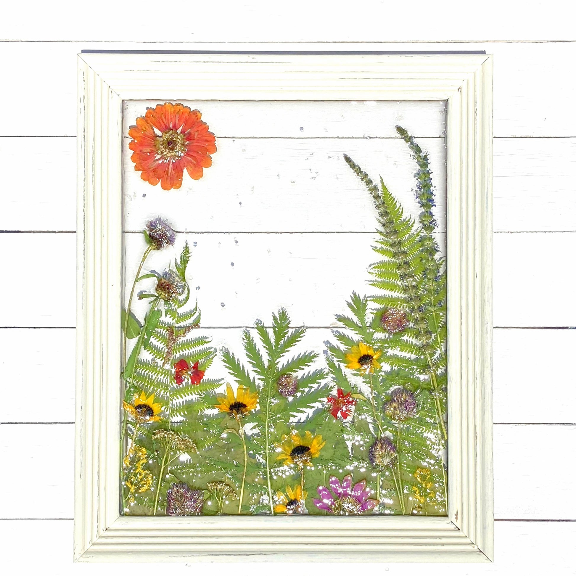 These whimsical frames are created from flowers and fauna gathered from our gardens and when on nature walks. We take delight in creating happy scenes that we hope will bring a smile to your face and light up your space with color and joy.